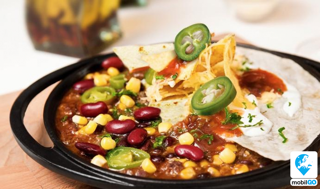 (marhahús, kukorica, vörösbab, hagyma, fokhagyma, tortilla, tejföl, mozzarella)