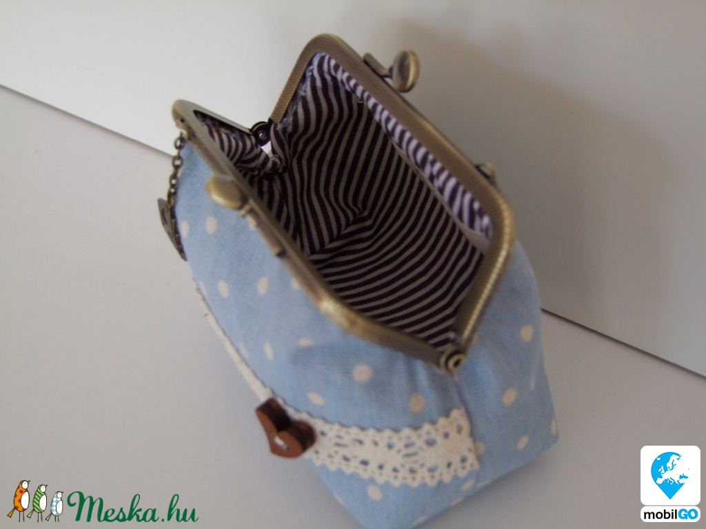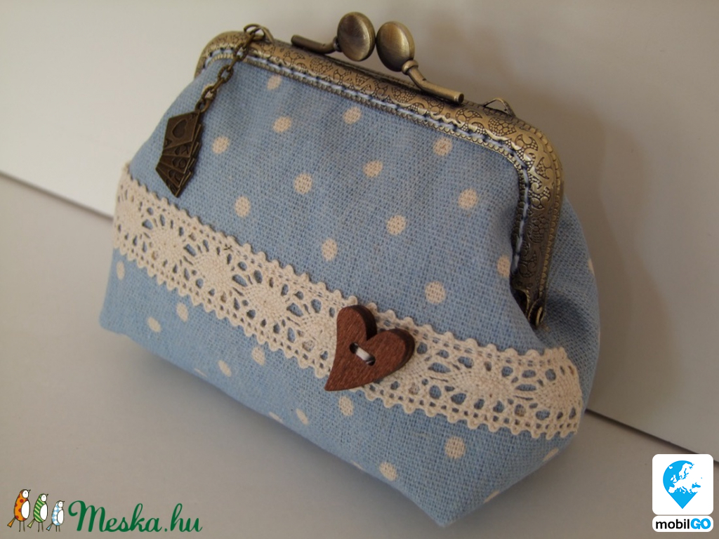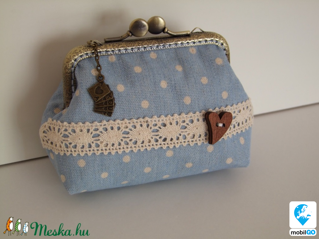 Minőségi világoskék alapon krémszínű pöttyös lenvászonból varrtam antik díszes bronz keretre, pamutcsipkével és szív alakú fagombbal és kis fityegővel díszítettem.