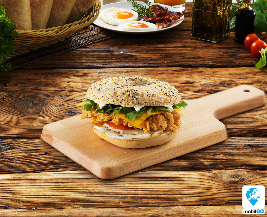 Hot&Spicy csirkemell csík, friss hazai tojás a KFC titkos fűszereivel, ömlesztett cheddar, rukkola és majonéz egy magvas bagelben.