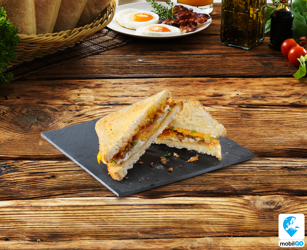 Friss hazai tojás a KFC titkos fűszereivel, vaj, ömlesztett cheddar, pirított hagyma, metélőhagyma és majonéz, kenyérszeletek között összesütve.