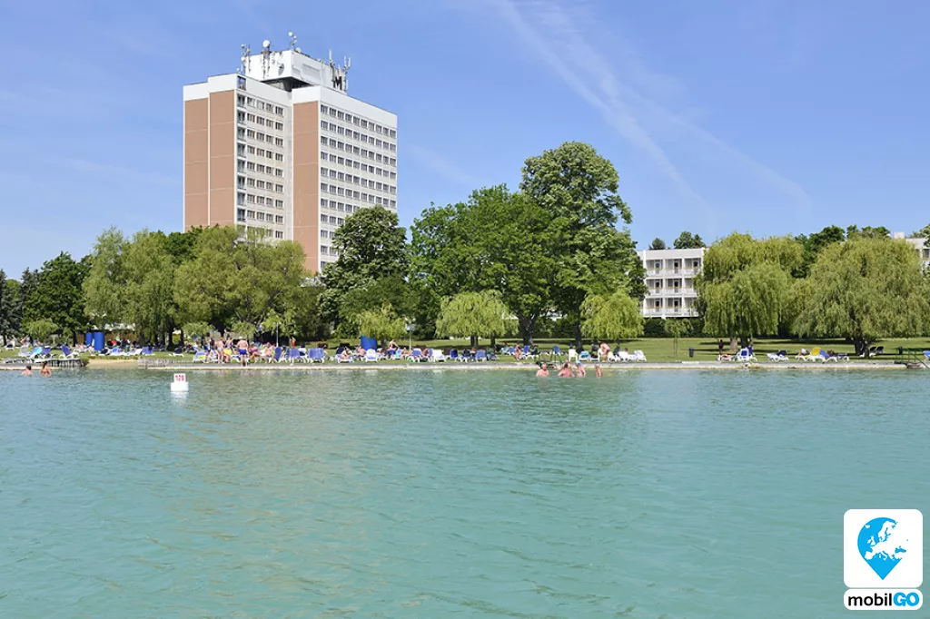A balatonfüredi Hotel Marina strandja homokos gyereklagúnát, fedett úszómedencét, egy