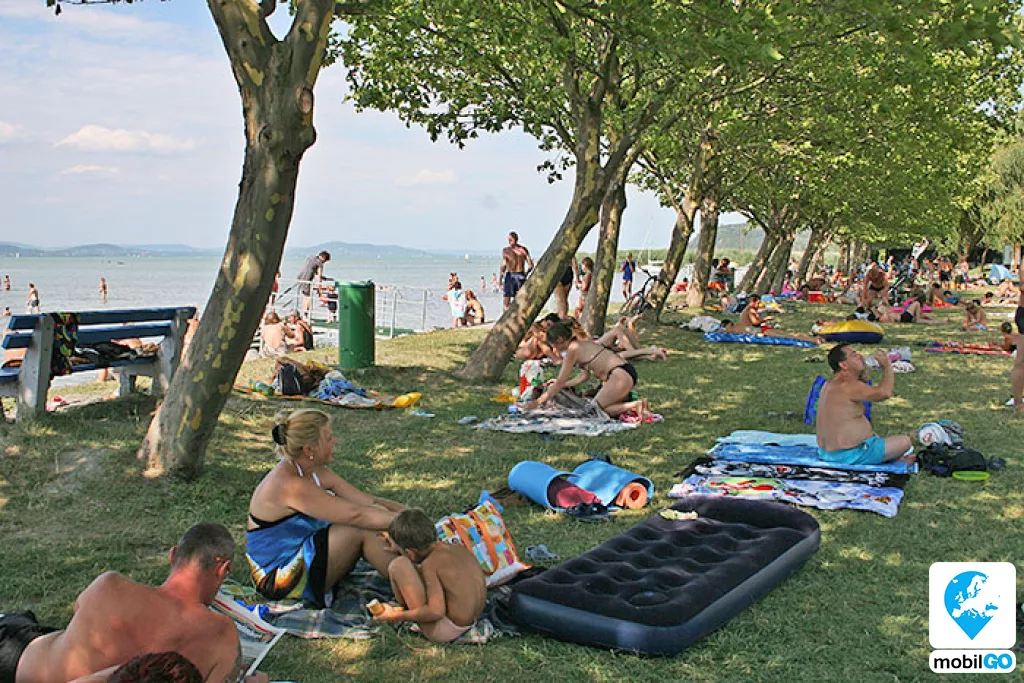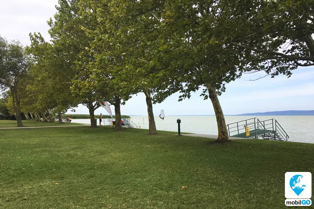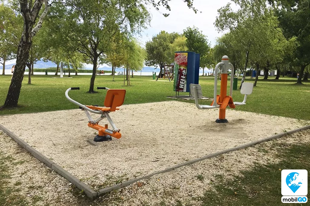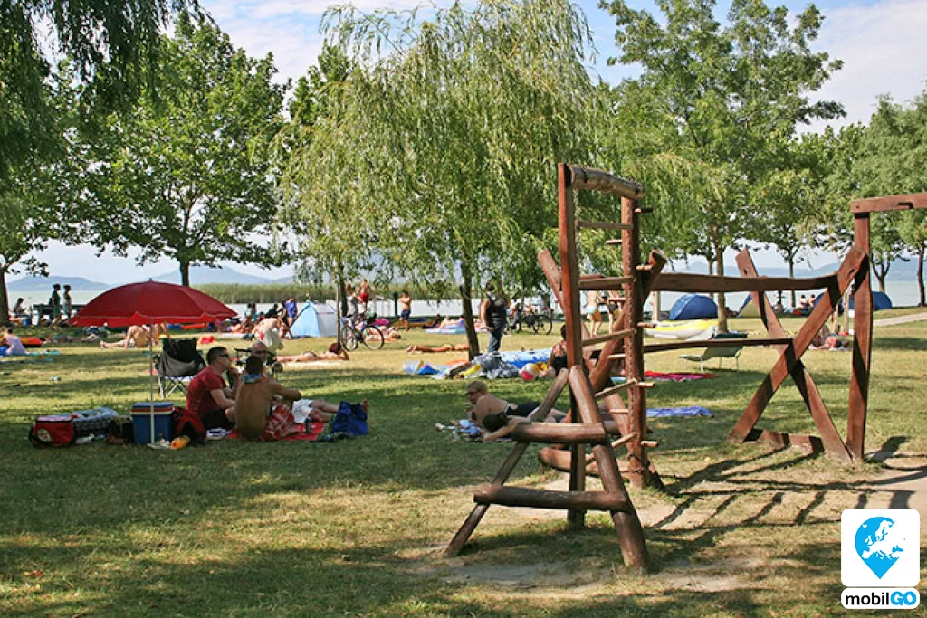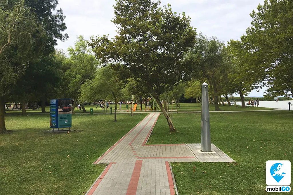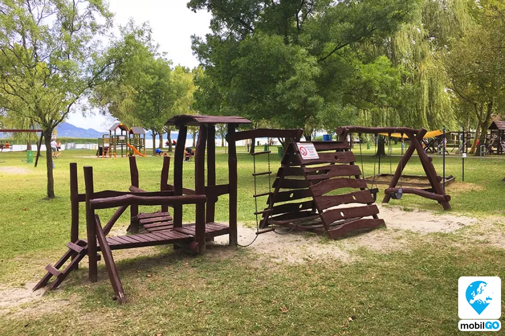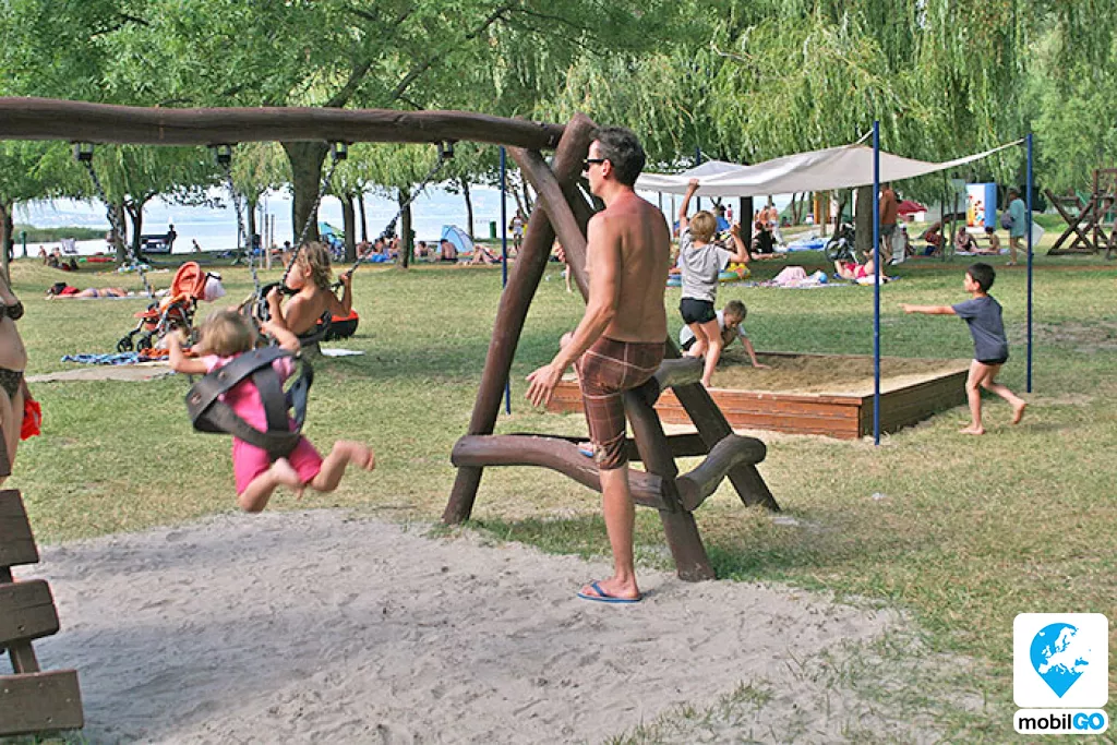 A strandot gondozott pázsit borítja, területén fák sorakoznak. Ahogy a település többi strandján, itt is ingyenesen lehet használni a bevizsgált és évente ellenőrzött játszótereket, öltözőket, WC-ket, hidegvizes zuhanyzókat. A büfék – falatozók változatos étel és ital kínálattal rendelkeznek (lángos, palacsinta, pizza, hamburger, hot-dog, egytál ételek, fagylalt, jégkrém, stb.)