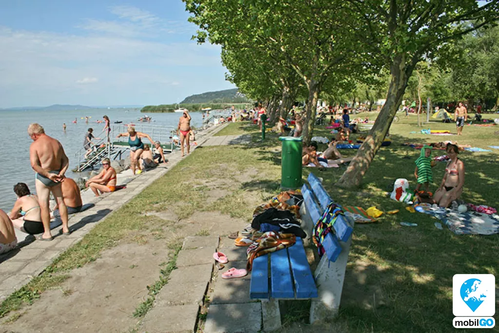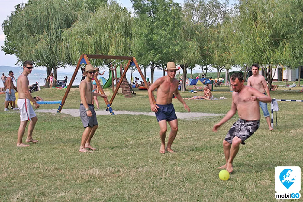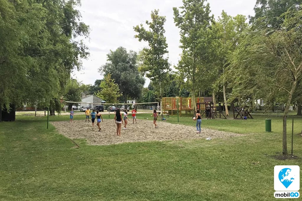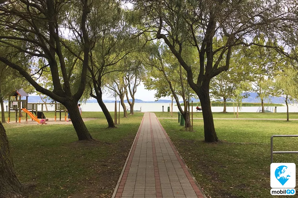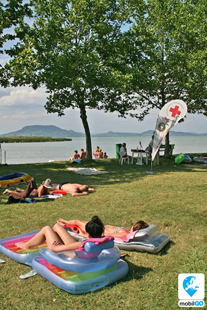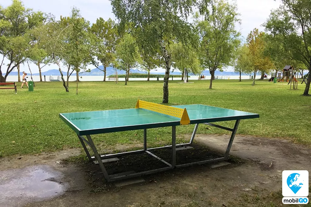 A strandot gondozott pázsit borítja, területén fák sorakoznak. Ahogy a település többi strandján, itt is ingyenesen lehet használni a bevizsgált és évente ellenőrzött játszótereket, öltözőket, WC-ket, hidegvizes zuhanyzókat. A büfék – falatozók változatos étel és ital kínálattal rendelkeznek (lángos, palacsinta, pizza, hamburger, hot-dog, egytál ételek, fagylalt, jégkrém, stb.)