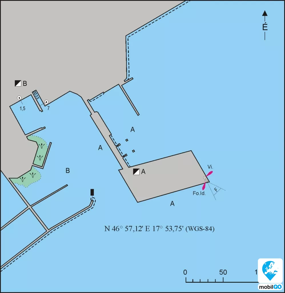 Szolgáltatások: kikötő, áram, elsősegély, CHEM WC, WC, zuhany, ivóvíz, étterem, hajó