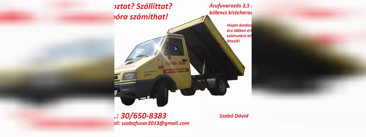 Fuvaroztat? Szállíttat? A Szabóra számíthat! Hívjon bizalommal és az áru időben érkezik, mert számunkra lehetetlen nem létezik! Fuvarvállalás a nap bármely szakaszában telefonos egyeztetés után. Anyagbeszerzés, költöztetés stb. Ha fuvarra van szükség hívjon bátran garantáltan nem fog csalódni az árban! Önnek nincs más dolga mint felvenni velünk kapcsolatot telefonon vagy e- mailben és a többit mi intézzük. Legyen szó anyagbeszerzésről, költöztetésről, vagy akár csak egy A pontból B- be való szállításról! Kérjen árajánlatot még ma akár telefonon a 30/ 650 83 83 - mas telefonszámon vagy e- mailben a címen! Fuvarvállalás a hét minden napján non stop!