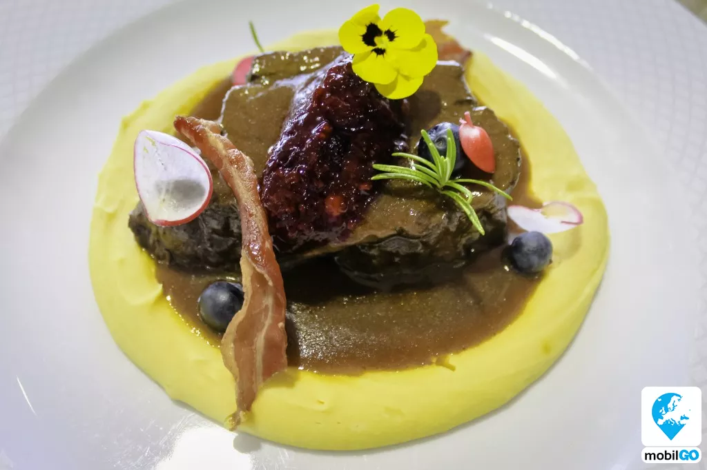 Sertéstarja mustáros hagymaraguval, burgonya püré