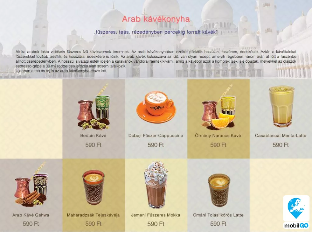 Kávéházainkban vendégeink termékeinken keresztül „megkóstolhatják” a világot. Nálunk mindig frissen pörkölt, kézzel többször átválogatott, arabica ültetvény–kávé ritkaságokból készülnek az italok. Kávéházainkban különböző receptek alapján több mint 70 kávéféleséget kínálunk vendégeinknek, nálunk az összes jelentős „kávé–konyha” (olasz, francia, japán, arab, amerikai, latin) megtalálható.