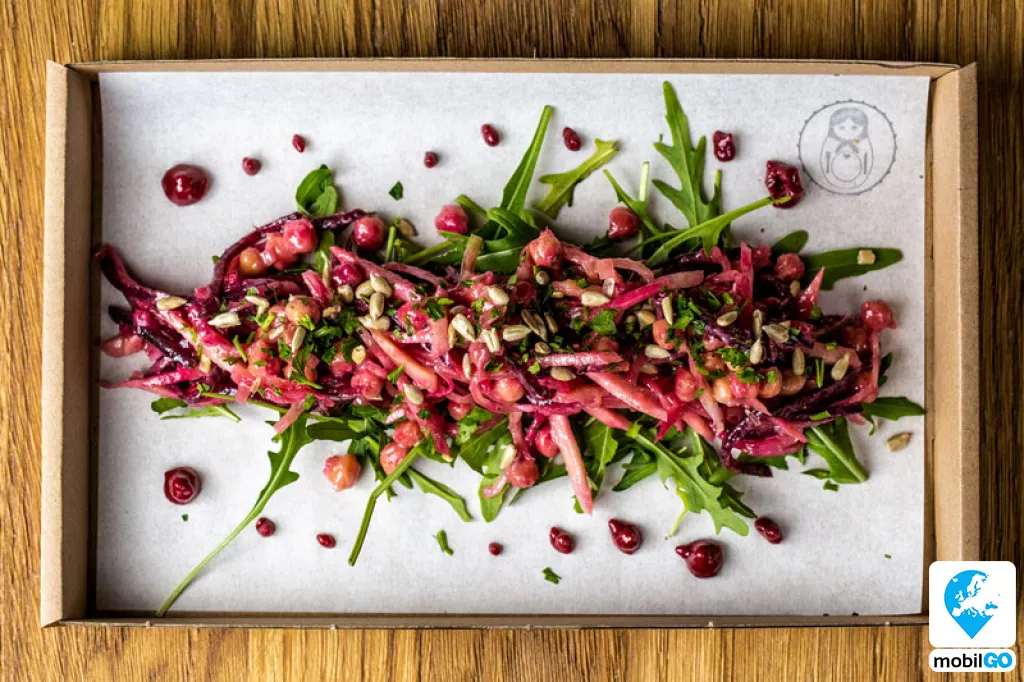 Az orosz tulajdonosnak köszönhetően a legnépszerűbb orosz ételek vegán változatai is megtalálhatók, úgymint borscs, szirnyiki, pelmeny, orosz fekete kenyér. Minden étel a konyhánkban készül, beleértve a burgerekhez sütött bucikat is, amelyek között gluténmentes változat is van. Nem használunk tartósítószereket, színezékeket, adalékanyagokat, csak egészséges alapanyagokat. Azt mondjuk, a mi konyhánk őszinte konyha, mivel mindenki láthatja, hogyan készül a megrendelt étele.