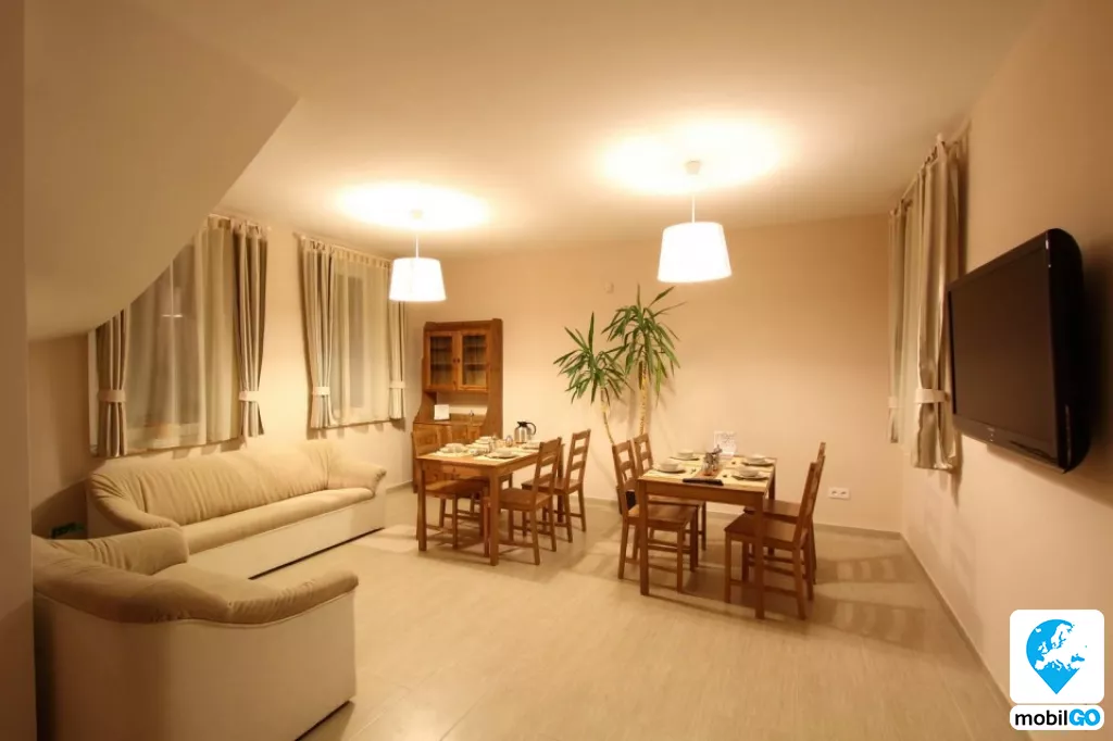 A ház kétágyas szobákkal rendelkezik. A hét szobából 3-hoz tartozik saját fürdőszoba, a másik két-két szobához egy-egy közös fürdőszoba áll rendelkezésre. Vendégeink részére a WiFi térités-mentes. A két konyhát vendégeink igényeik szerint használhatják. A szobák önállóan riaszthatók, ha igény van rá. Az egész apartman-ház füstjelzővel van ellátva. (A tűzjelző riasztása 50.000 Ft büntetést von maga után.) Vendégeink gépjárműveit kamera “védi”.