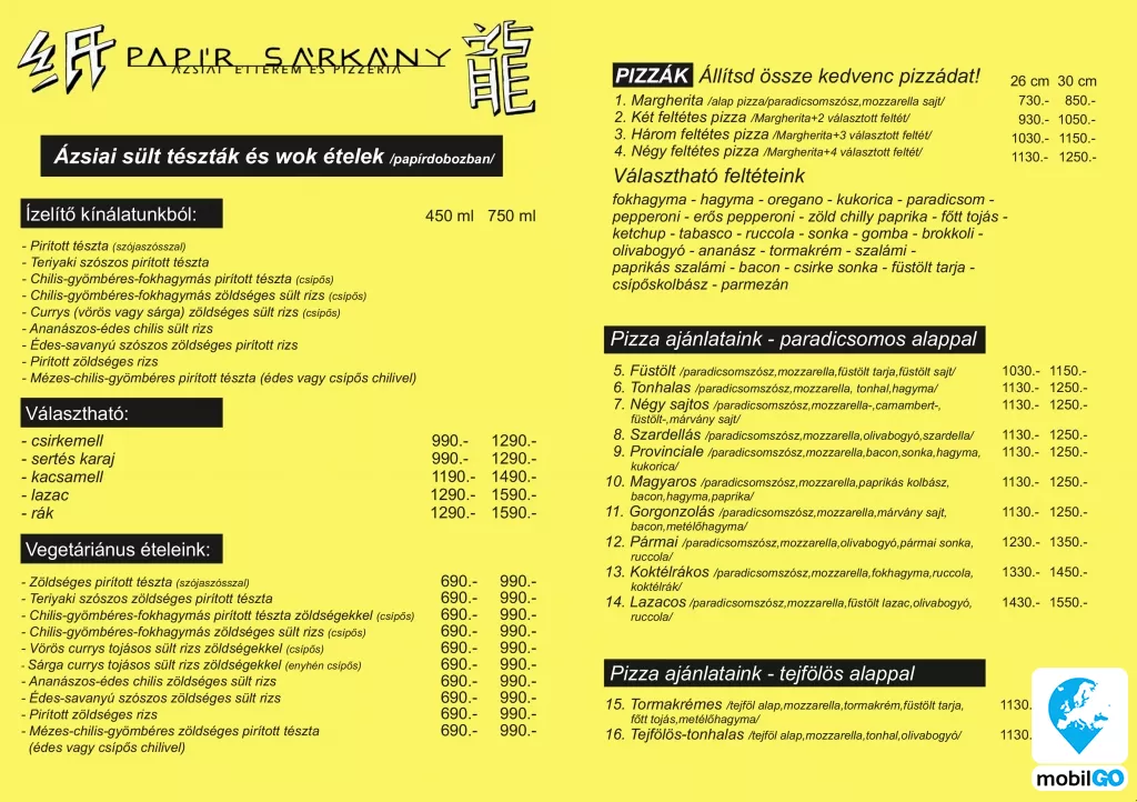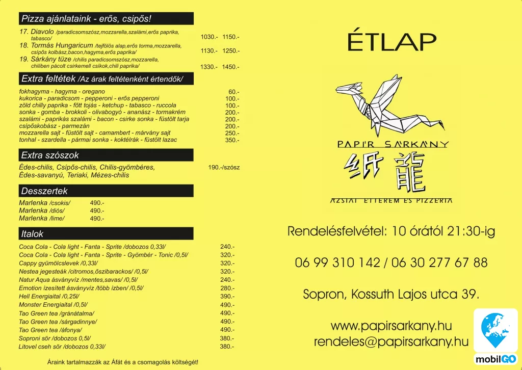 A Papír Sárkány Étterem az ételeket mindíg frissen,kizárólag rendelésre készítík el.rendelését 60 percen belül kiszállítjuk Sopronban,azonban ez rossz időjárási viszonyok vagy forgalmi akadályoztatás esetén váltizhat.Minimális rendelési érték: 990 ft.