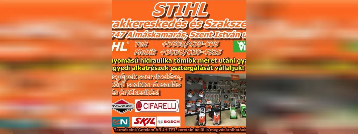 STIHL szakkereskedés és szakszerviz Almáskamaráson! Magasnyomású hidraulika tömlők méret utáni gyártását és egyedi alkatrészek esztergálását vállaljuk!