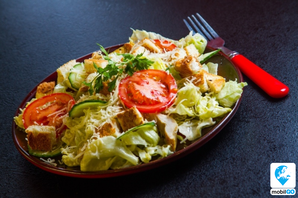 jégsaláta, uborka, paradicsom, cézár öntet, csirkemell, pirítós