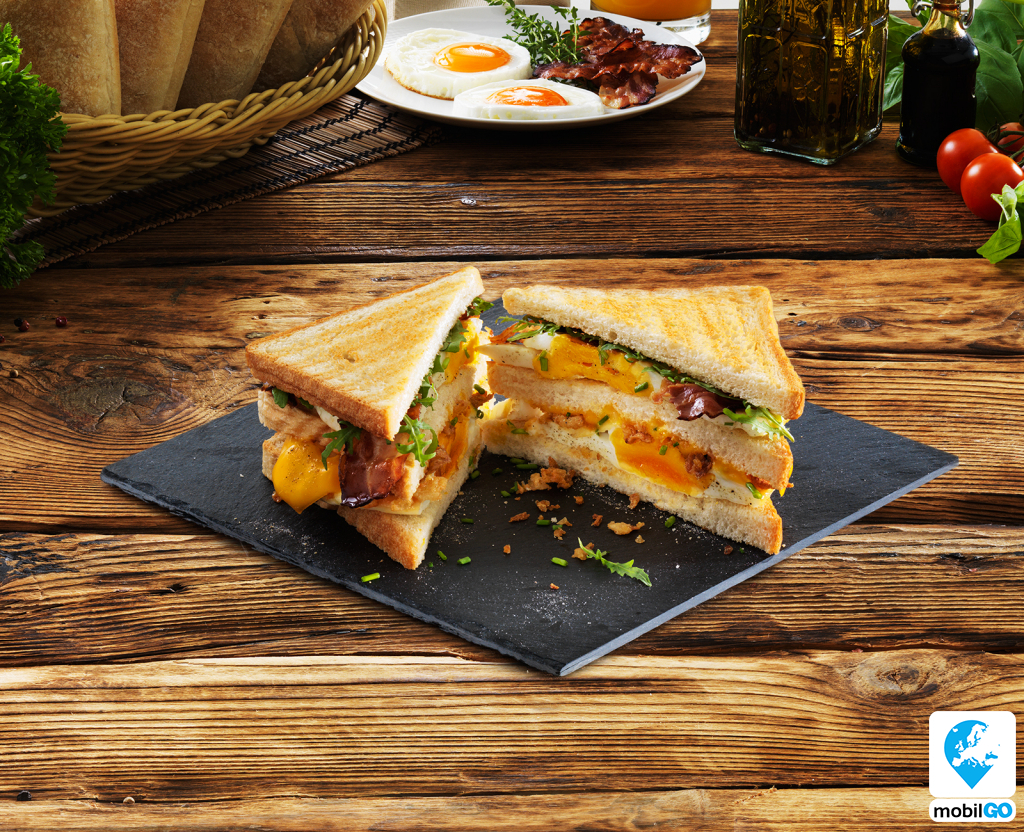 Friss hazai tojás a KFC titkos fűszereivel, sült bacon szeletek, vaj, pirított hagyma, metélőhagyma, ömlesztett cheddar és majonéz, kenyérszeletek között összesütve.