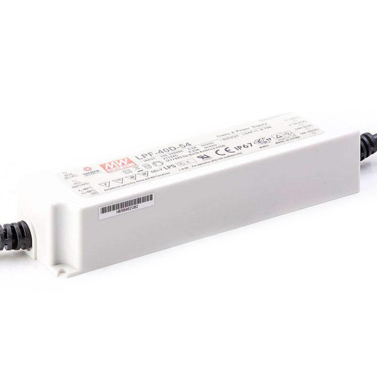 Egykimenetes Mean Well tápegység Class 2 Vin:90-305 VAC/127-431 VDC, Vout: 54 VDC / 0-0.76A, P:40 W, PFC szűrős, 162.5 x 42.5 x 32 mm (L x W x H), dimmelhető ((1-10vDC, PWM kontrollerrel vagy potméterrel), IP67-es védelem