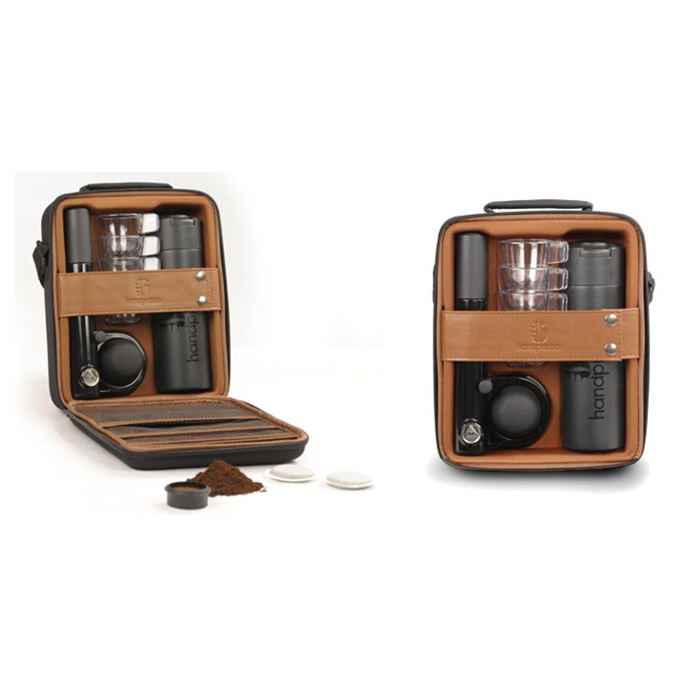Főbb jellemzők: A Handpresso WILD hybrid kézi presszókávé készítő géppel 16 bar nyomás állítható elő, mint egy kerékpár pumpával, ezt követően a termoszból forró vizet beleöntve, már csak az őrölt kávét vagy E.S.E podot szükséges beletenni, hogy a kiváló minőségű espresso elkészüljön. Nincs szükség, elemre, akkumulátorra vagy elektromos áramra. A készülék mellett ez a kiránduló táska a következő tartozékokat tartalmazza: 4 törhetetlen presszókávés csészét, egykezes termoszt, törlőkendőt.