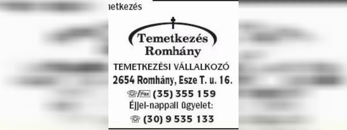 Temetkezési vállalkozás Romhány, Nógrád megye Temetkezési Vállalkozásunk 1995. óta végzi szolgáltatását Romhányban és a környezõ településeken, de megkeresés esetén és a helyi temetõ üzemeltetõvel történt egyeztetés után az ország bármely területére elmegyünk. Munkákban fontos szerepet kap a hozzátartozókkal való szoros kapcsolattartás egészen a szertartás végéig. A búcsú mindig nehéz, de a nehéz órákban támaszai vagyunk a hozzánk fordulóknak és mindent megteszünk annak érdekében, hogy az Utólsó Út, valóban méltó legyen az elhunyt és a Család számára. Bármilyen kérdése van a szertartás lebonyolításával kapcsolatban, szakértõ munkatársain várják esetleges kérdéseiket, a nap minden órájában a06 35/355- 159 vagy a 06 30/9535- 133- as telefonszámon, vagy személyesen irodánkban.